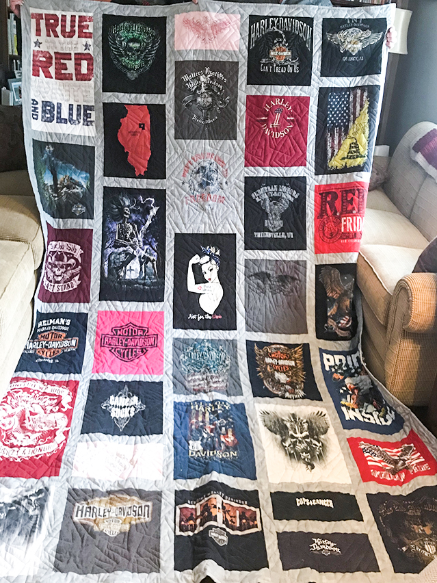 Prices include cutting the shirts, stabilizing the shirts, all sewing, and backing. All quilts are professionally quilted, batting included, and the edge binding is finished by hand or machine. Prices also include fabric for backing, and binding. There is an additional charge of $50 if sashing is desired.